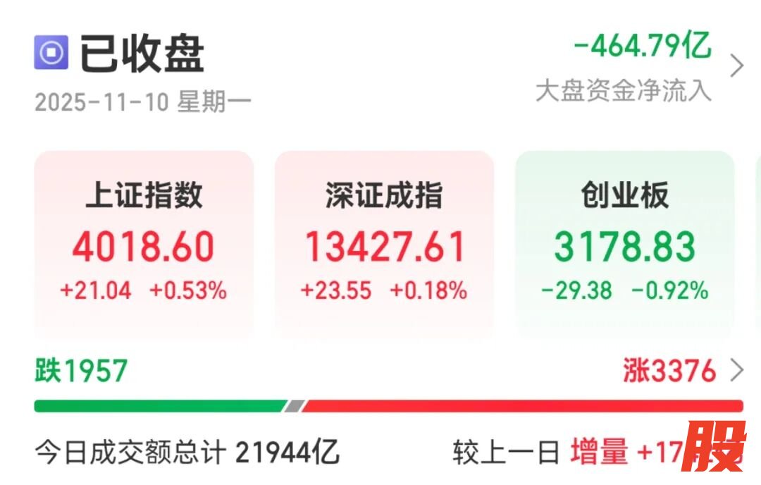 截至收盘,上证指数涨0.53%,深证成指涨0.18%,创业板指跌0.92%。全市场成交额超2.19万亿元,较上一个交易日放量1742亿元。